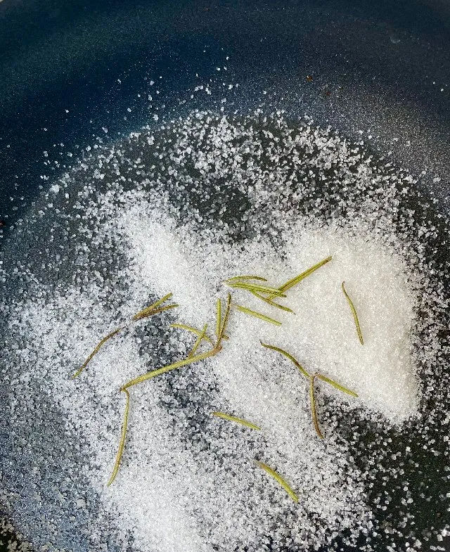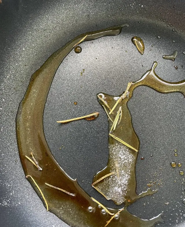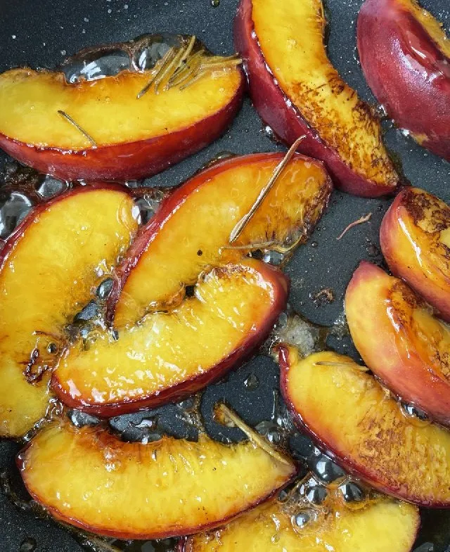 Lõigake virsik viiludeks. Ma ei eemalda koort, nii säilitavad need karamellistamisel hästi oma kuju. Kuivale mittenakkuvale pannile lisage suhkur ja rosmariin.